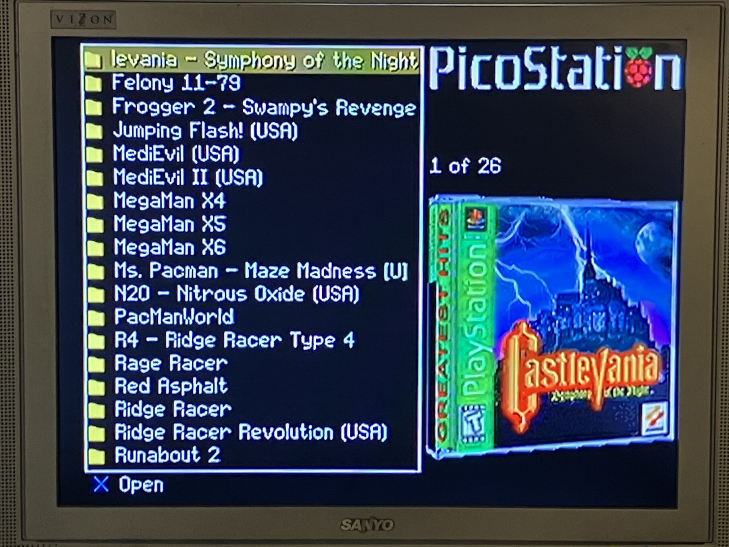 With the finished product I loaded up an SD card with a bunch of PS1 games. I wasn’t much into the PS1 30 years ago during its lifespan beyond the initial release when a friend let me borrow his for a few weeks and I was playing the hell out of the first Ridge Racer game. I was more into the Atari Jaguar and later the Sega Saturn, though I did spend some time (and money) on some PS1 racing games along with a MadCatz steering wheel and pedals in 1997-ish. I missed a lot of good games, so now it’s time to do a little catching up.