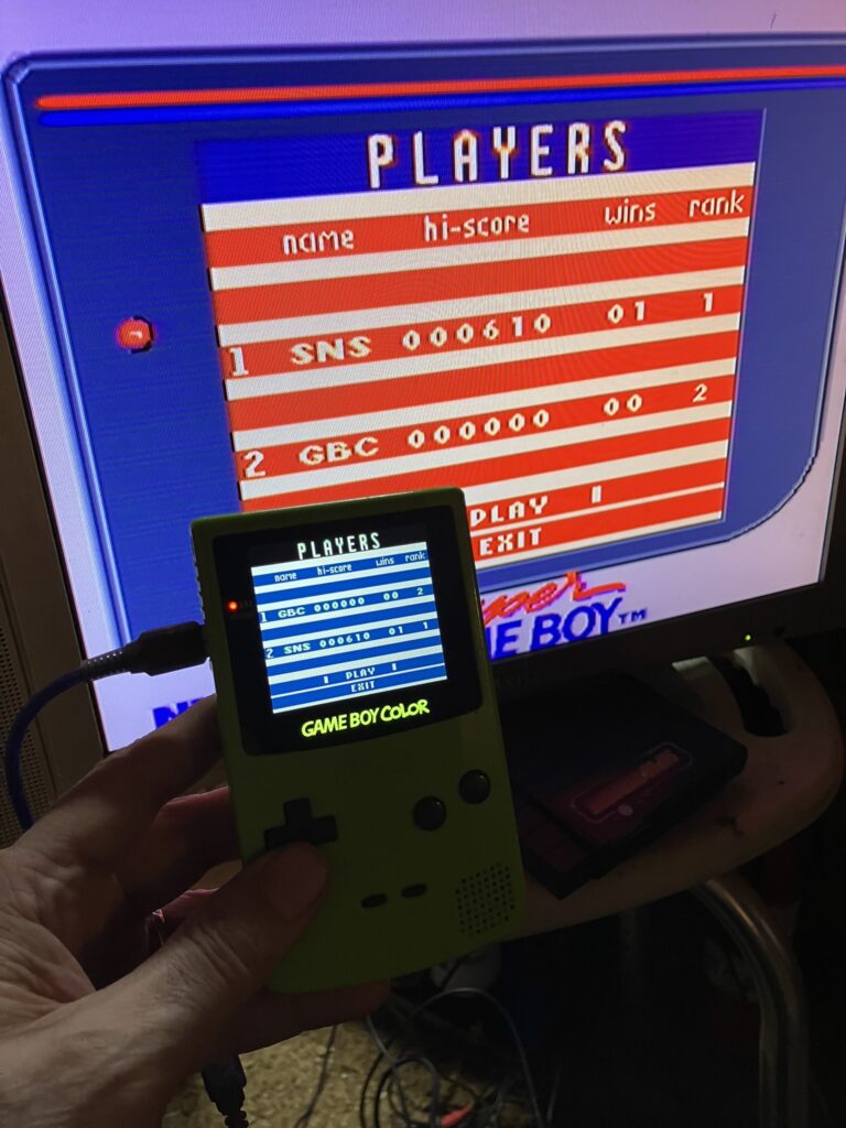 And finally, here is a screenshot of the SGB link in action, connected to a Game Boy Color unit (with the sweet, sweet OLED screen that I added), playing the only cartridge I have that supports link functionality (*sigh*), Zoop.